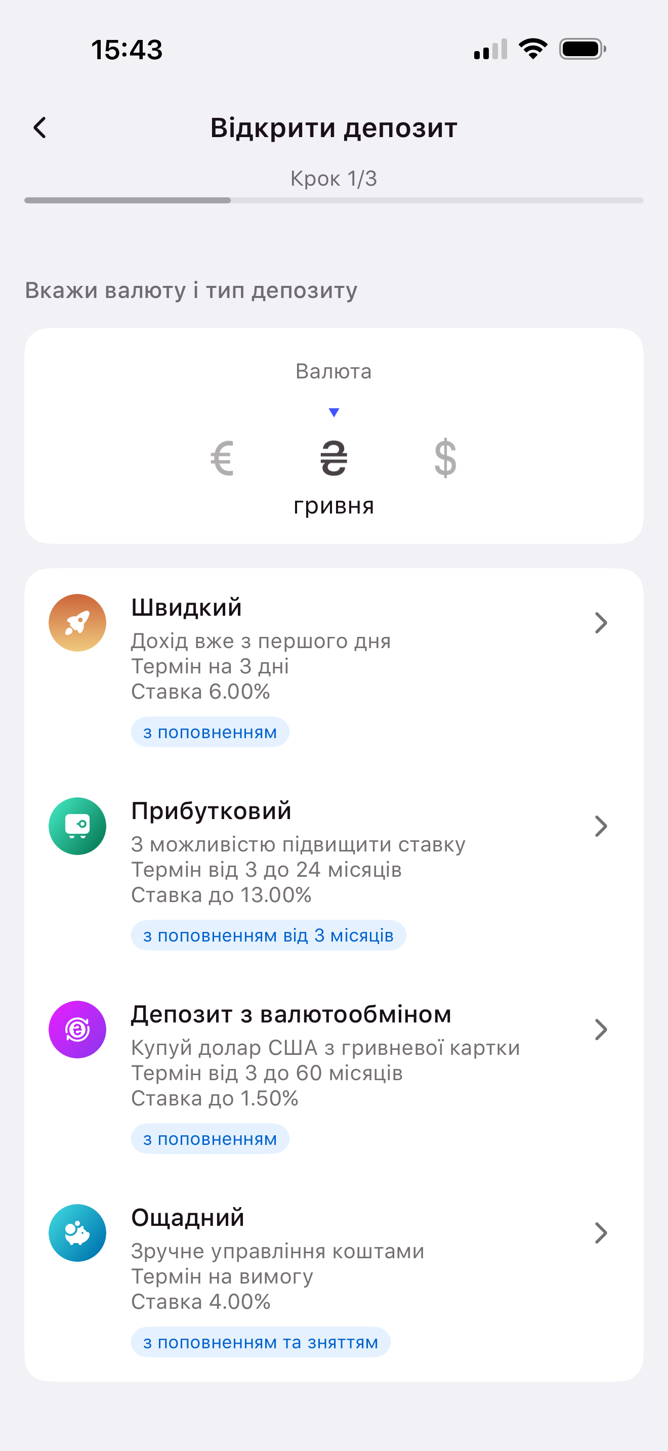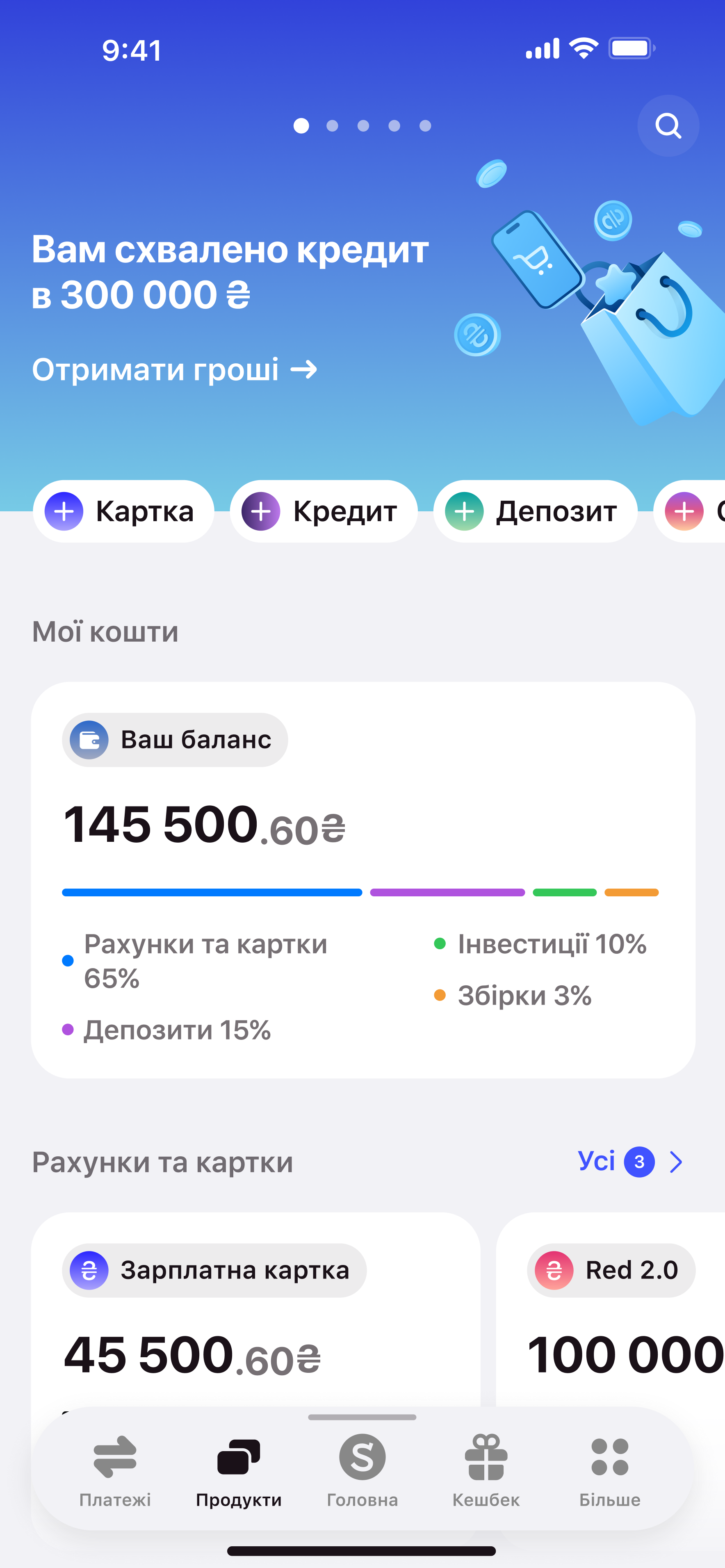 Продукти, де розташовані усі ваші картки, рахунки, депозити, кредити та інвестиції у вигляді зручних віджетів, а також є кнопки швидких дій.
