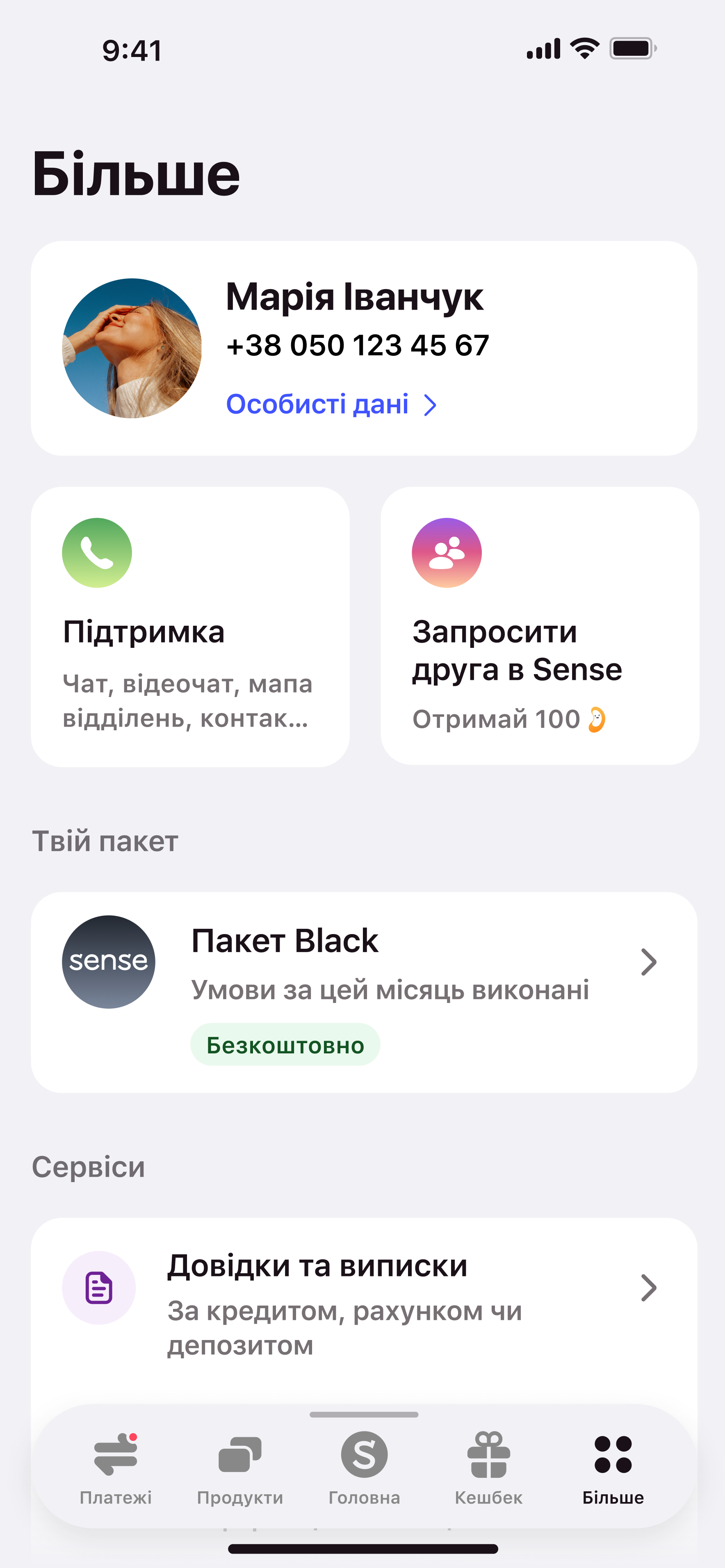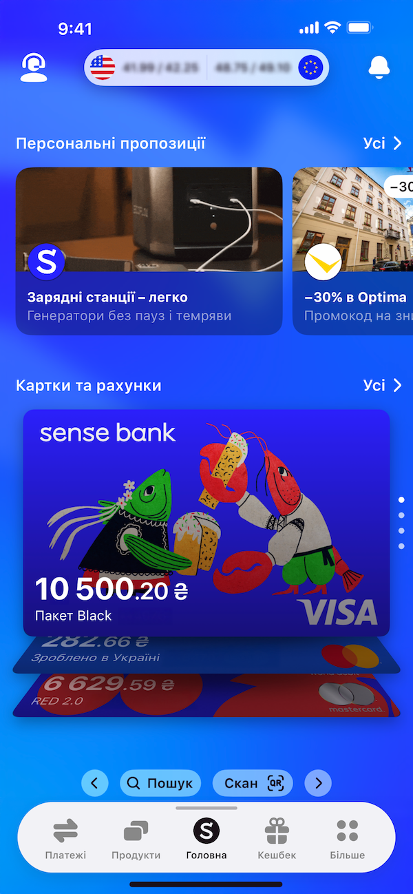 Sense SuperApp — це універсальний онлайн-банкінг зі зручним та багатофункціональним інтерфейсом. Основні функції доступні на п'яти кнопках меню: